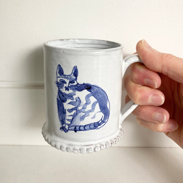 A hand thrown small earthenware cup with white slip decoration, hand painted on both sides with coloured oxides, with a white gloss glaze, inspired by early delftware ceramics and antique Nursery ware. (Could also be for espresso!)