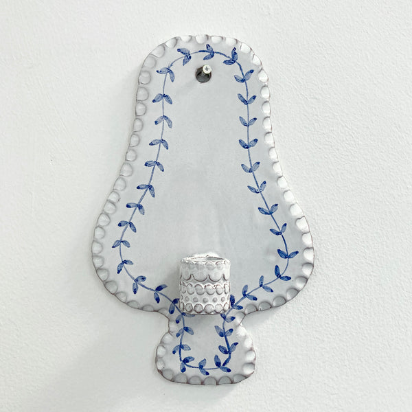 A hand made ceramic candle sconce for wall hanging, inspired by early English Delftware. This piece is hand painted with cobalt blue oxide.