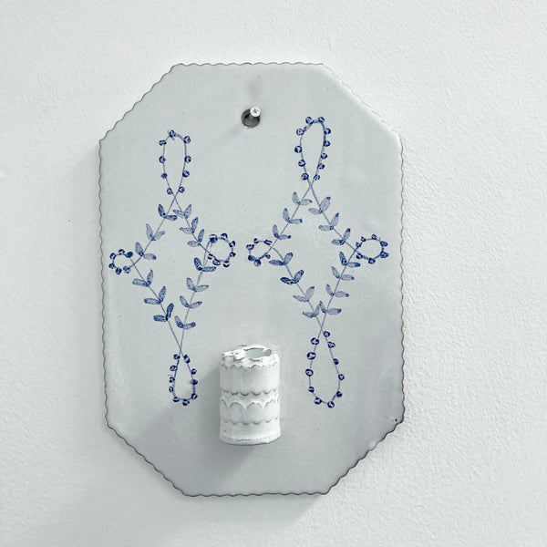 A hand made ceramic candle sconce for wall hanging, inspired by early English Delftware. This piece is hand painted with cobalt blue oxide.