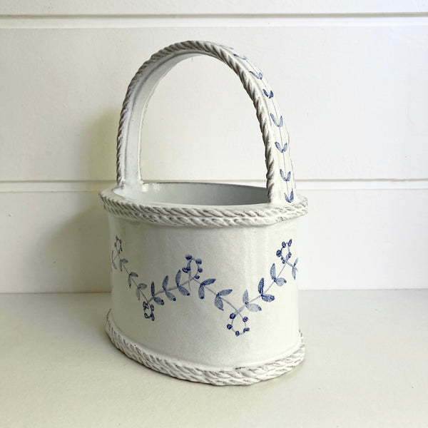 Hand painted oval shaped basket vase. Handmade in earthenware, with sprig decoration, painted with cobalt oxide with a white gloss glaze, inspired by early delftware ceramics.