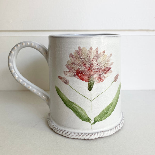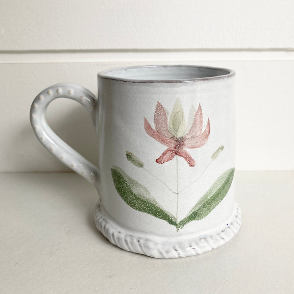 Hand thrown earthenware cup with white slip decoration, hand painted with coloured oxides, with a white gloss glaze, inspired by early polychrome delftware ceramics.