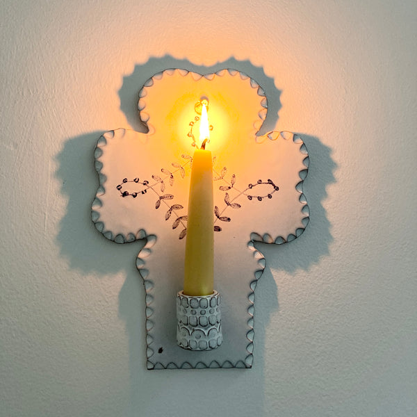 A hand made ceramic candle sconce for wall hanging, inspired by early English Delftware. This piece is hand painted with cobalt blue oxide.