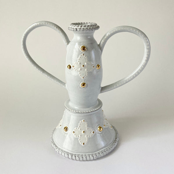 This tall hand thrown candlestick is inspired by 17th century English lacework and the decoration is a contemporary take on ‘bianco-sopra-bianco’ (white on white) which was a decorative technique used in English delftware in the 18th century. The process creates different layers of depth, opacity and tones of white. Additional hand painted 24ct gold lustre elements are designed to catch the light by day or by candlelight at night.  Each piece is unique with hand made and applied raised sprig decoration. The pieces go through three firings- bisque, glaze and lustre to achieve the final work.