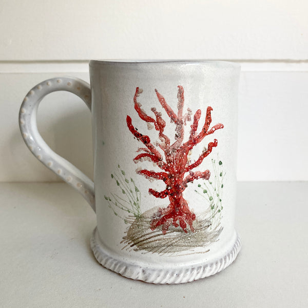 Hand thrown earthenware cup with white slip decoration, hand painted with coloured oxides, with a white gloss glaze, inspired by early polychrome delftware ceramics.